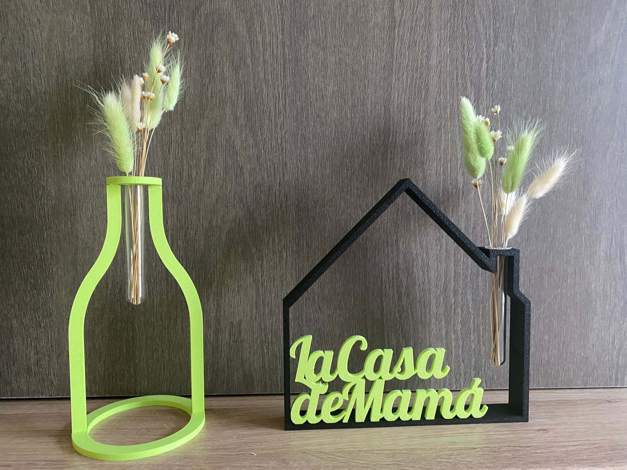 Volledig te personaliseren. Kies de (hoofd)kleur van het huisje, de (2de) kleur en inhoud van de tekst en de kleuren van de droogbloemen.